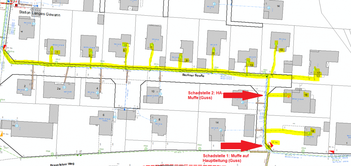 In diesem Bereich befinden sich neben der Hochdruckgasleitung auch noch drei wichtige Trinkwasserleitungen, die die Tiefbauarbeiten erschweren: Aktuell ist das genaue Schadensbild/Umfang noch nicht bekannt, sodass umfangreiche Vorarbeiten notwendig sind, um für alle Eventualitäten vorbereitet zu sein.