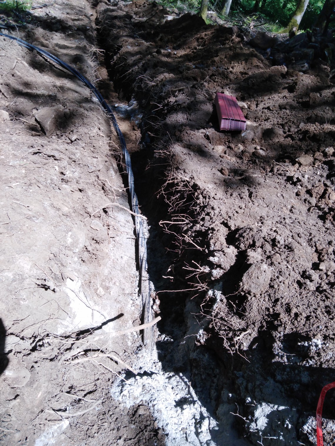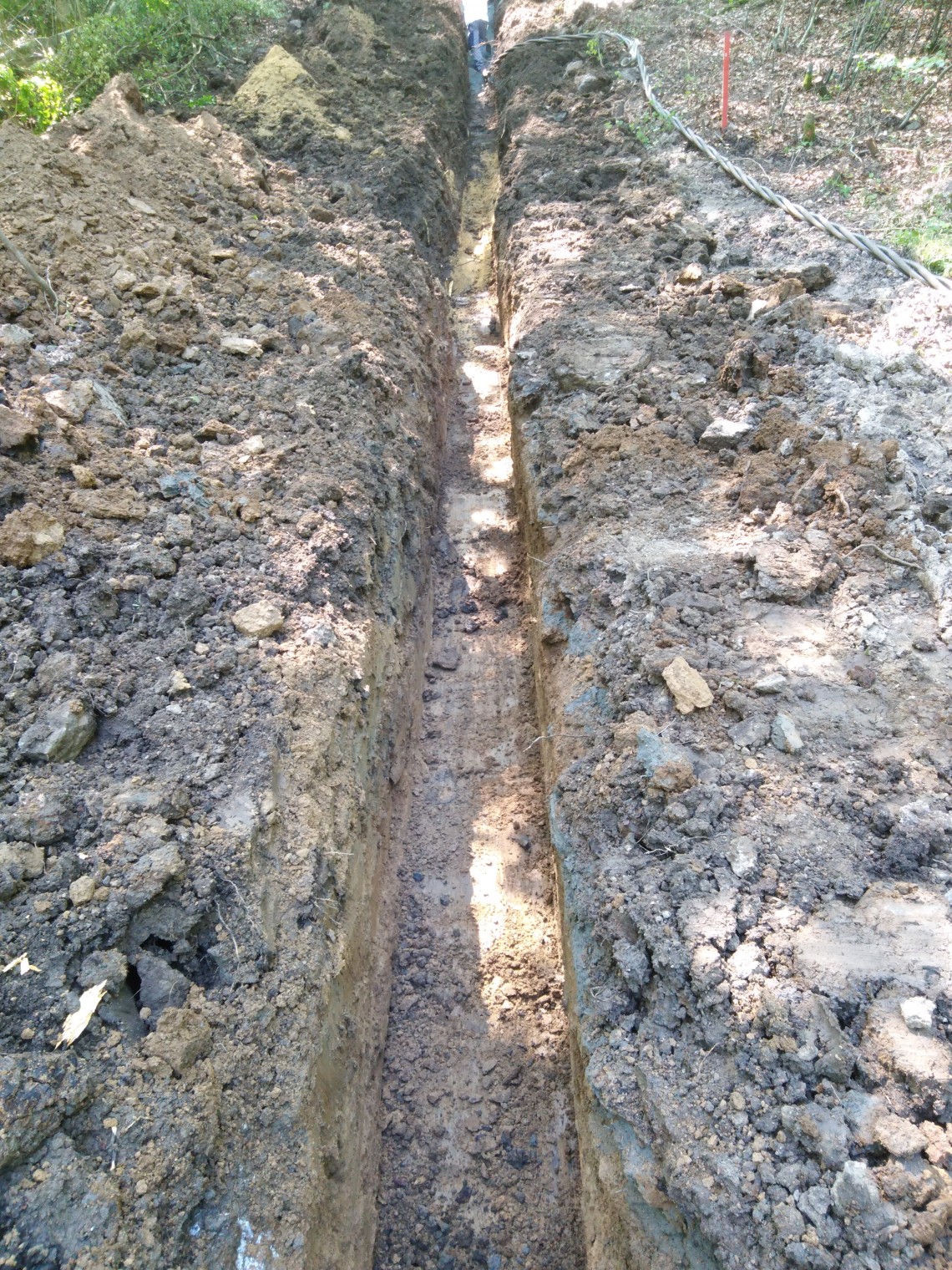 Zunächst wurde die Leitungstrasse „freigeräumt“, am 28.5. das neue Kabel abgetrommelt und seitlich entlang der Trasse gelagert. Die Kabelgrabenarbeiten wurden im Zeitraum vom 31.5.21 bis 8.6.21 durchgeführt. Die Ausführung erfolgte abschnittsweise, d. h. Öffnen des Grabens auf rd. 30m, Kabeleinbau, Absandung, Verfüllung vom Funkturm zur Schaltanlage an der B456.