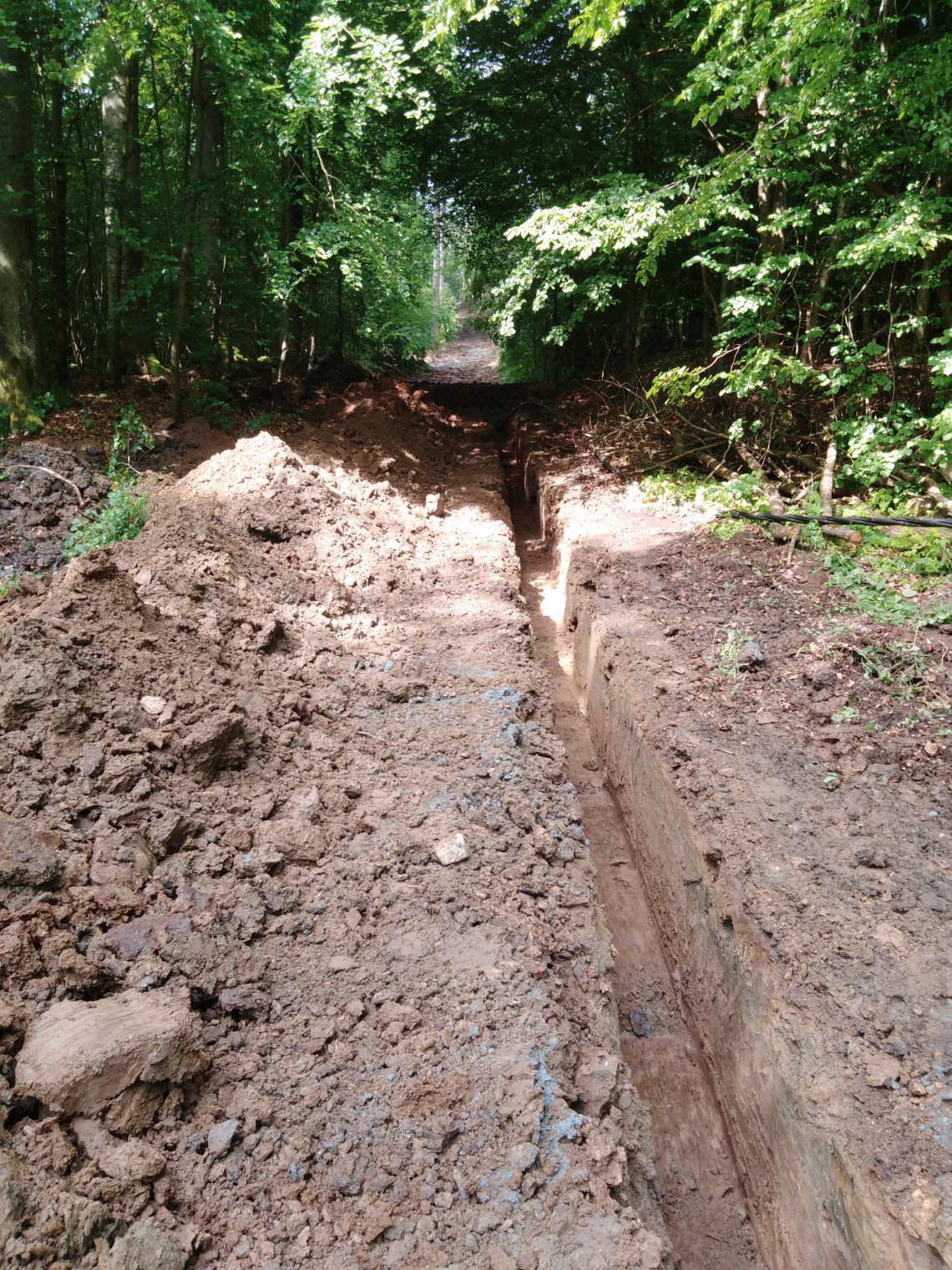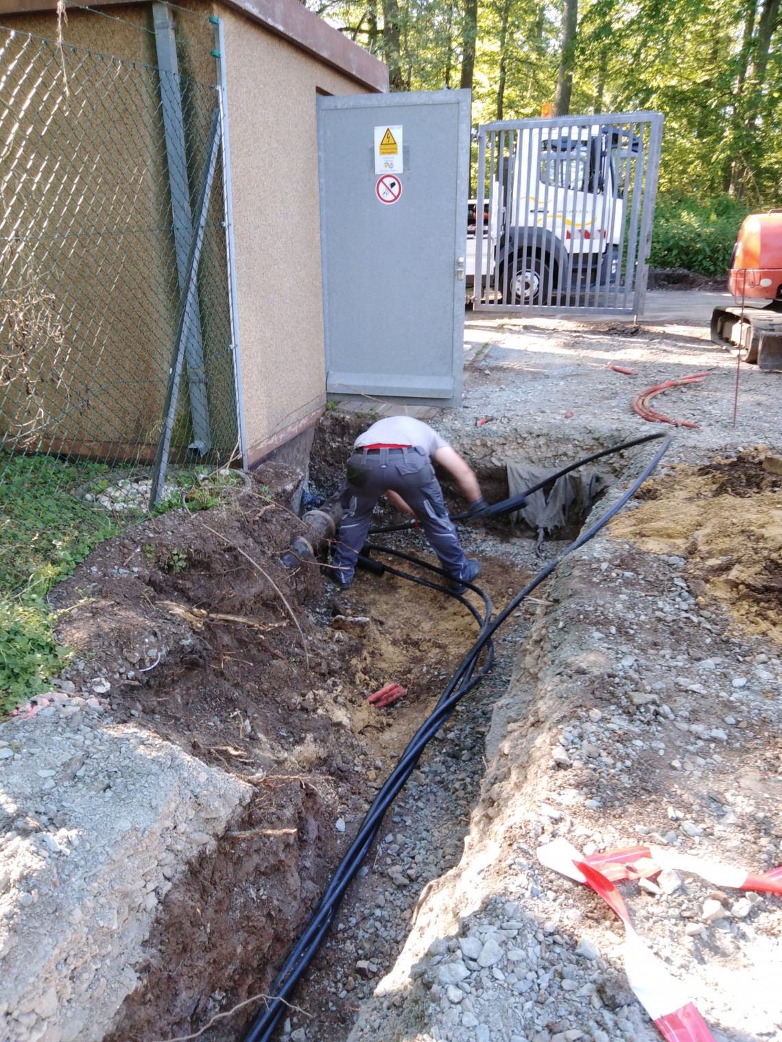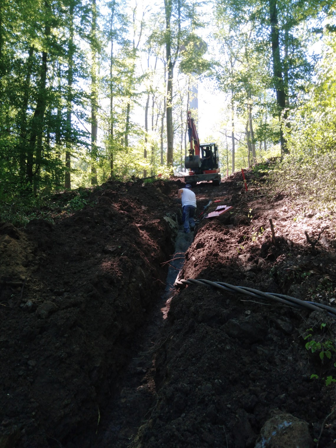 Die Stadtwerke Weilburg GmbH hat das stark beschädigte 20kV-Kabel kurzfristig auf etwa 300m im Waldgebiet in Weilburg in offener Bauweise erneuert. Aufgrund der Wichtigkeit bestand Gefahr im Verzug, sodass wir umgehend mit der Maßnahme beginnen mussten.